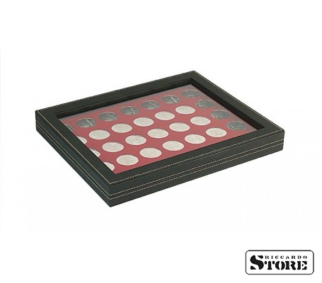 NERA M PLUS kast tumepunase plaadiga ja 35 ümmarguse lahtriga, mõeldud müntide jaoks, mille läbimõõt on 32,5 mm, näiteks Saksamaa hõbedaste müntide hoiustamiseks, mille nimiväärtus on 20/10 eurot.