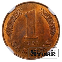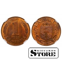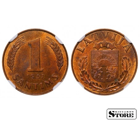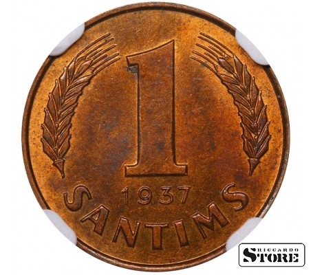 Pronksist Läti Vabariigi 1 santīmi münt aastast 1937, standardne käibemünt seerias 1937–1939 Esimese Vabariigi perioodist. Aversil on Läti väike vapp tammeokste kohal, reversil nimiväärtus ja aastaarv okste vahel. Tüübi andmed: kaal 1,8 g, läbimõõt 17 mm, WWC number KM#10 (Numista N#4917). Eksemplar on NGC poolt hinnatud MS 62 RB (Mint State 62, Red Brown).