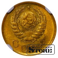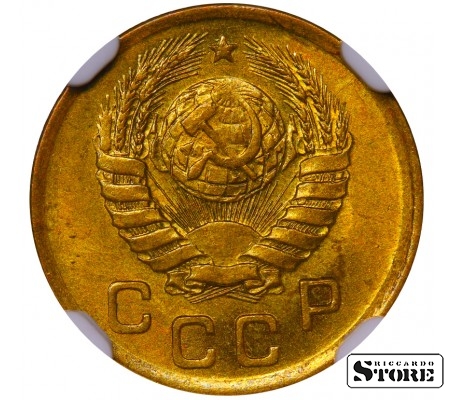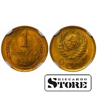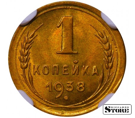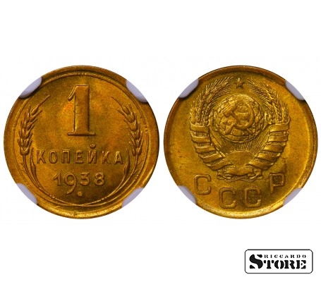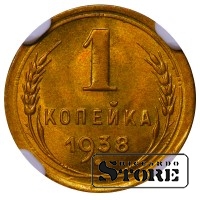 NSVL münt väärtusega 1 kopikas, välja antud 1938. aastal. Seisund MS 66 (NGC), materjal — alumiinium-pronks. Kaal umbes 1 g, läbimõõt ~15,2 mm, sooneline serv. Tavaline ringluse münt Staliniajal.