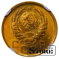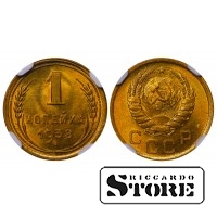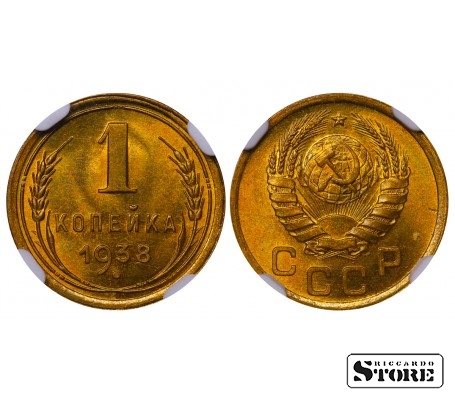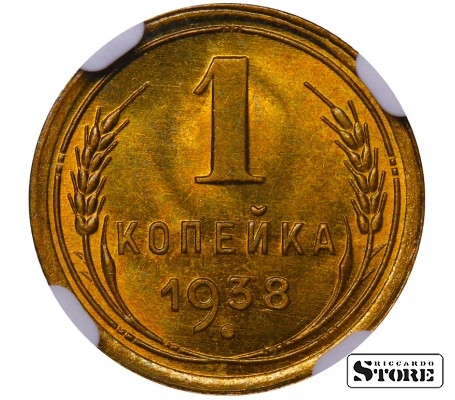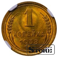 NSVL münt nimiväärtusega 1 kopikas, välja antud 1938. aastal. Seisund MS 65, materjal — alumiinium-pronks. Kaal 1 g, läbimõõt 15.2 mm. Standardne ringluse münt.