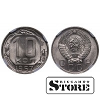 Nõukogude Liidu münt nimiväärtusega 10 kopikat, välja antud 1957. aastal. Seisund MS 64, materjal: vasel-nikkel. Läbimõõt 17,27 mm, kaal 1,8 g. Standardne ringluse münt, mündi orientatsioon ↑↑.