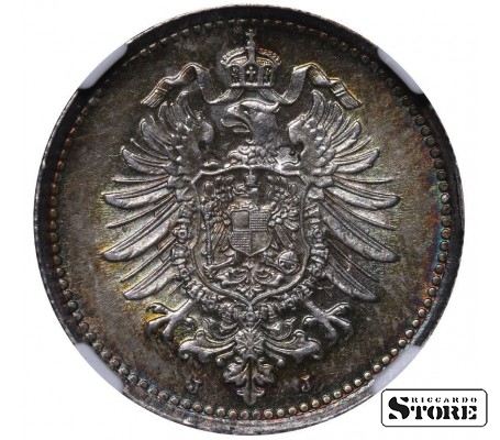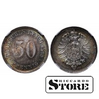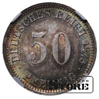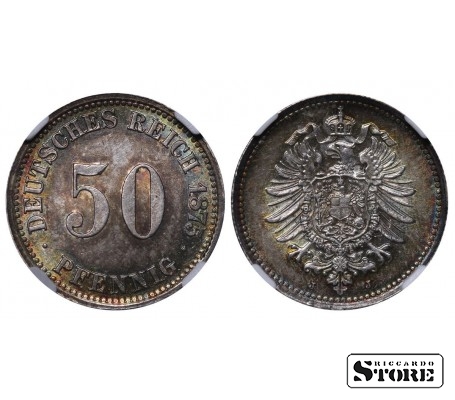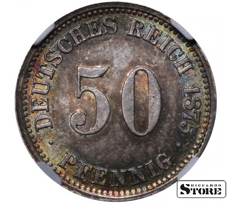 Saksamaa impeeriumi münt nominaaliga 50 pfennigit, löödud aastal 1875 Hamburgi (J) rahapajas. Seisund MS 64, “Top Pop” (üks parimatest populatsioonis), materjal hõbe (0,900). Kaal 2,78 g, läbimõõt 20,00 mm, serv rihveldatud. Klassikaline hõbemünt Vilhelm I ajal.