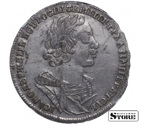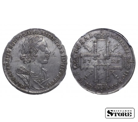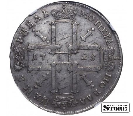 Vene Impeeriumi hõbemünt nimiväärtusega 1 rubla, välja antud 1725. aastal keiser Peeter I Suur (1721–1725) valitsemise ajal. Materjal — hõbe, kaal 28,44 g. Sertifitseeritud NGC hinnanguga XF DETAILS.