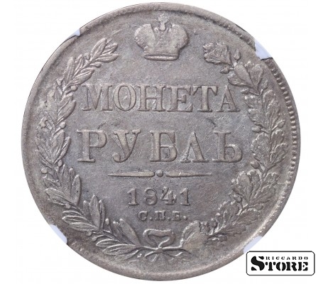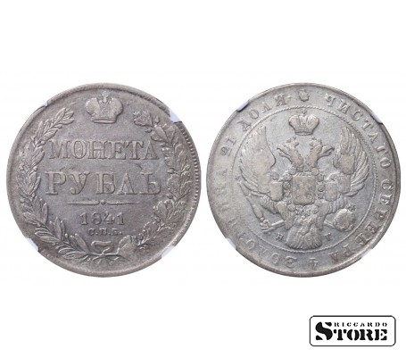 Vene Impeeriumi hõbemünt nimiväärtusega 1 rubla, välja antud 1841. aastal Peterburi rahapajas keiser Nikolai I (1825–1855) valitsemise ajal. Materjal — hõbe, kaal 20,73 g. Sertifitseeritud NGC hinnanguga VF 35.