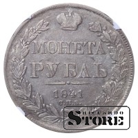 Vene Impeeriumi hõbemünt nimiväärtusega 1 rubla, välja antud 1841. aastal Peterburi rahapajas keiser Nikolai I (1825–1855) valitsemise ajal. Materjal — hõbe, kaal 20,73 g. Sertifitseeritud NGC hinnanguga VF 35.
