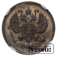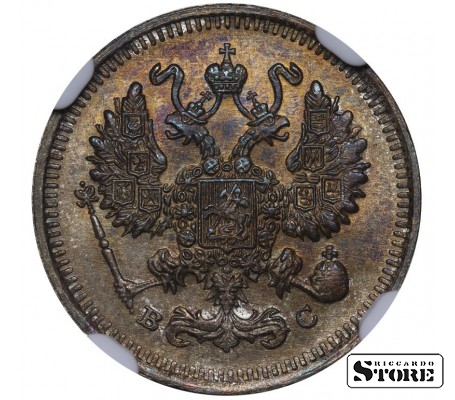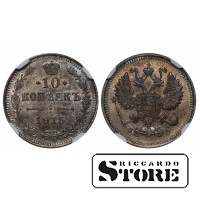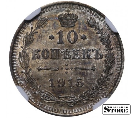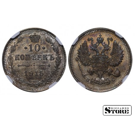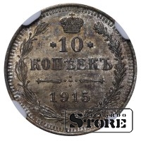 Vene Impeeriumi münt nimiväärtusega 10 kopikat, välja antud 1915. aastal keiser Nikolai II (1894–1917) valitsemise ajal. Materjal — hõbe, kaal 1,8 g. Sertifitseeritud NGC, hinnang UNC DETAILS.