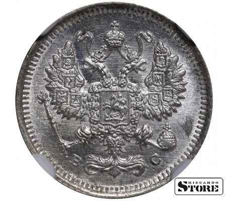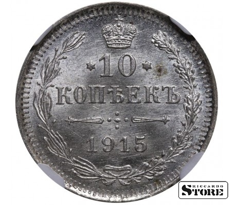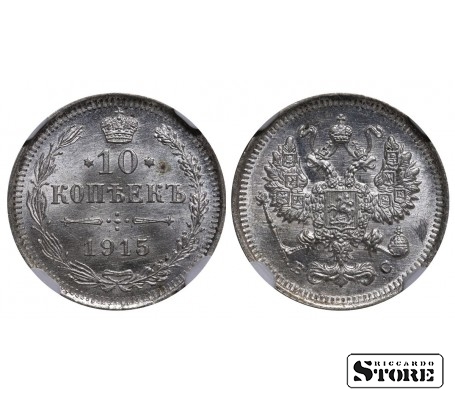 Vene Impeeriumi hõbemünt nimiväärtusega 10 kopikat, välja antud 1915. aastal keiser Nikolai II (1894–1917) valitsemise ajal. Materjal — hõbe, kaal 1,8 g. Sertifitseeritud NGC hinnanguga MS 66. Väga hästi säilinud kollektsioneerimismünt tugeva läikega.