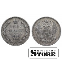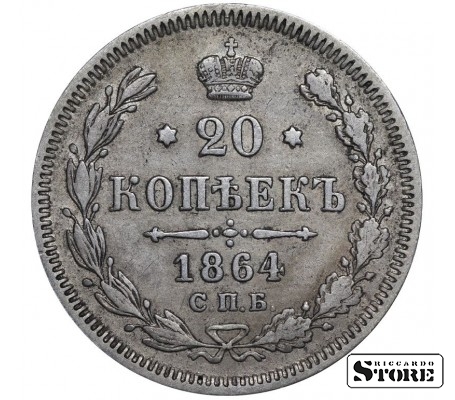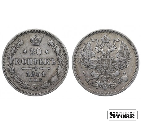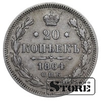 Vene Impeeriumi münt nimiväärtusega 20 kopikat, välja antud 1864. aastal keiser Aleksander II (1855–1881) valitsemise ajal. Materjal — hõbe, kaal 4,08 g.