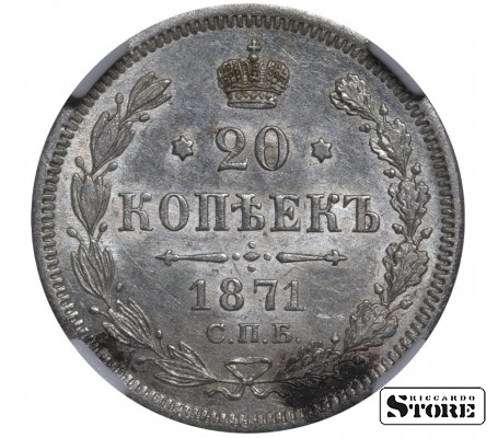 Vene Impeeriumi hõbemünt nimiväärtusega 20 kopikat, välja antud 1871. aastal keiser Aleksander II (1855–1881) valitsemise ajal. Materjal — hõbe, kaal 3,6 g. Sertifitseeritud National Numismatic Register (NNR) poolt. Väärtuslik kollektsioneerimismünt XIX sajandist.