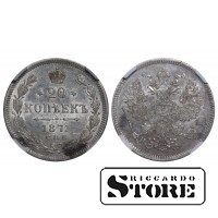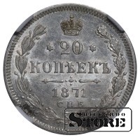 Vene Impeeriumi hõbemünt nimiväärtusega 20 kopikat, välja antud 1871. aastal keiser Aleksander II (1855–1881) valitsemise ajal. Materjal — hõbe, kaal 3,6 g. Sertifitseeritud National Numismatic Register (NNR) poolt. Väärtuslik kollektsioneerimismünt XIX sajandist.