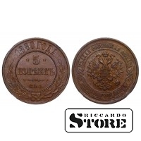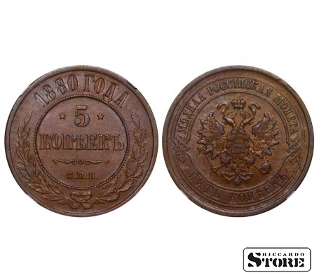 Venemaa Keisririigi münt nimiväärtusega 5 kopikat, välja antud 1880. aastal. Seisund AU 55 BN, materjal: vask. Läbimõõt 32,7 mm, kaal 16,38 g. Standardne ringluse münt, mündi orientatsioon ↑↑.