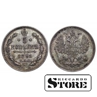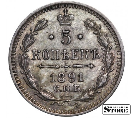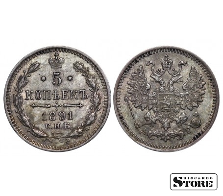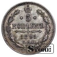 Vene Impeeriumi münt nimiväärtusega 5 kopikat, välja antud 1891. aastal keiser Aleksander III (1881–1894) valitsemise ajal. Materjal — hõbe, kaal 0,9 g.