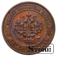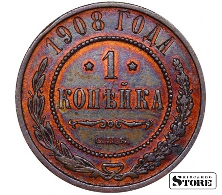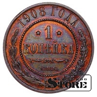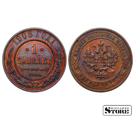 Vene Impeeriumi münt nimiväärtusega 1 kopikas, välja antud 1908. aastal keiser Nikolai II (1894–1917) valitsemise ajal. Materjal — vask, kaal 3,28 g.