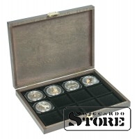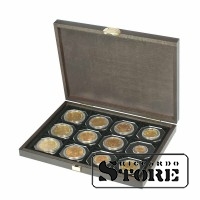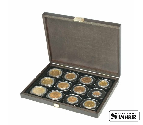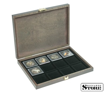 CARUS XM wooden cassette with 12 square compartments for coins/coin capsules with an external diameter of 52 mm.