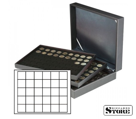Кассета NERA XL с 3 вкладышами и обтянутыми тёмно-красным велюром планшетами на 90 квадратных ячеек для размещения монет/монетных капсул диаметром до 38 мм.