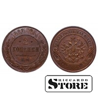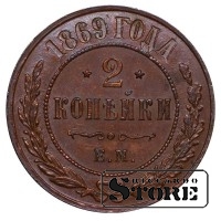 Медная монета Российской империи номиналом 2 копейки 1869 года, регулярный оборотный выпуск эпохи Александра II. Обозначение «ЕМ» указывает на Екатеринбургский монетный двор. Тип относится к большой серии медных 2-копеечников 1867–1914 гг.: на аверсе — двуглавый орёл с имперскими регалиями, на реверсе — номинал и дата в венке. Типовые характеристики: медь, вес 6.56 g, диаметр около 24.5 mm, гурт рубчатый. Каталожные номера WWC: Y#10.1 / Y#10.2 (в зависимости от разновидности).